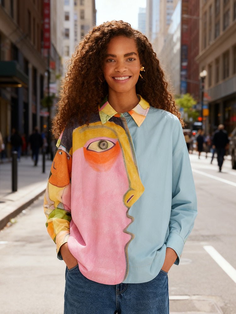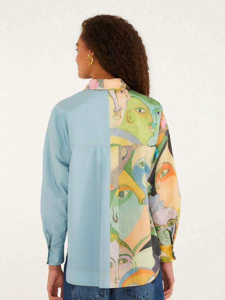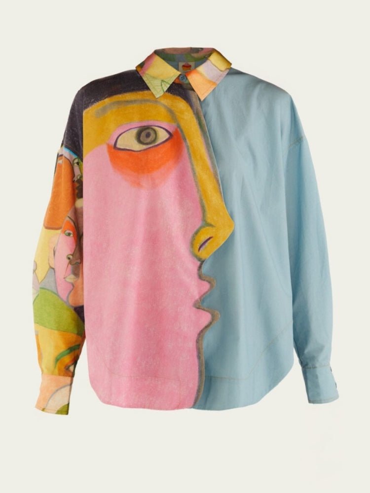 An artistic patchwork top featuring a bold abstract face print on one side with vibrant pink, yellow, and orange hues, and a soft light-blue panel on the other for striking contrast. The asymmetrical design and color-blocked neckline enhance the contemporary, avant-garde appeal, making it a statement piece for creative, fashion-forward styling.