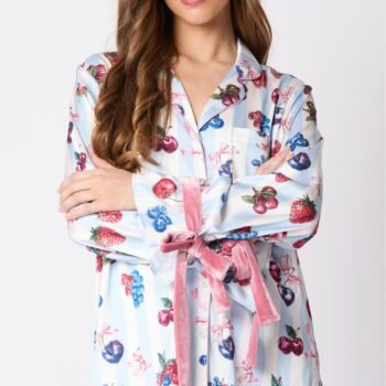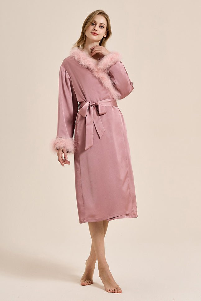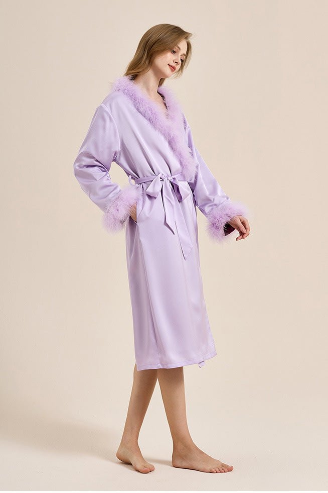 This sophisticated lilac robe, with its elegant lapel and delicate feather accents, transforms your loungewear into a statement of pure opulence.