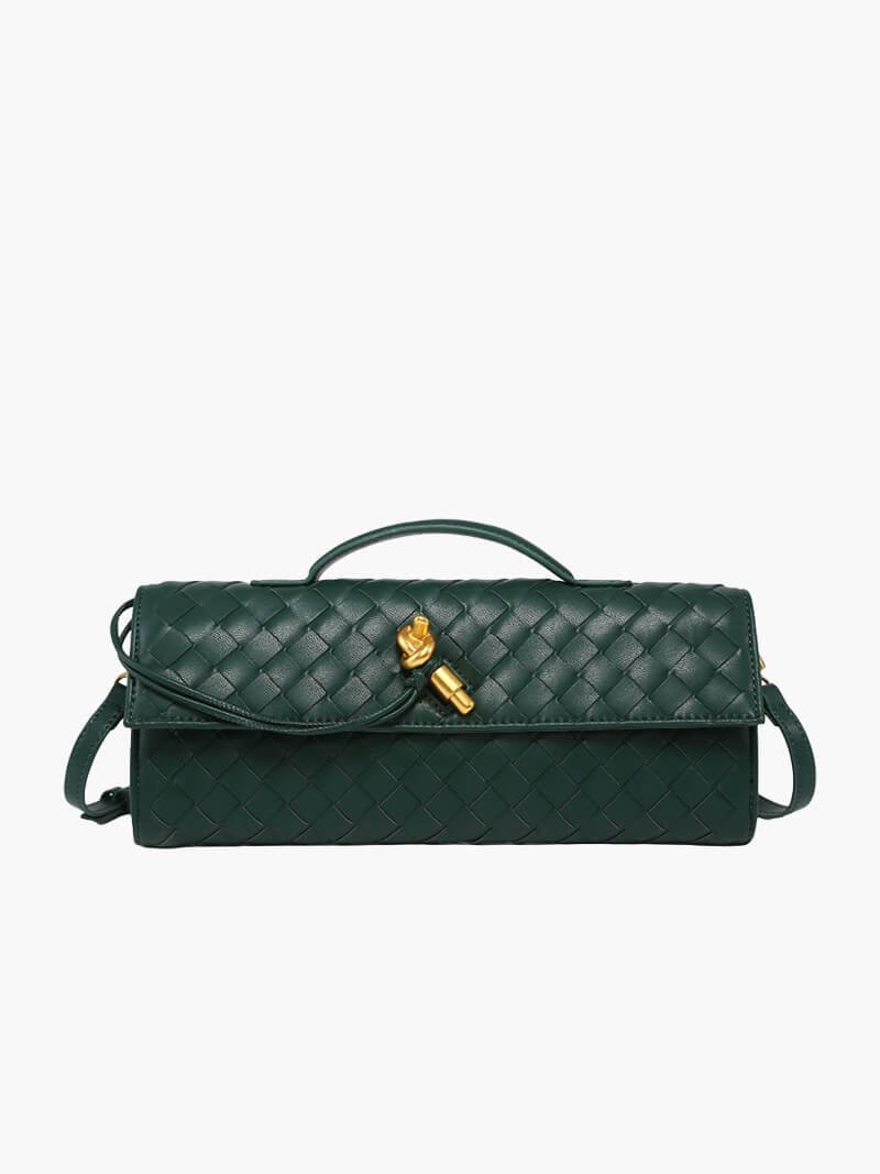 Expertly crafted from premium vegan leather, this bag features a beautifully woven texture enhanced by a unique knot tie detail with a polished gold-tone toggle fastening, adding a touch of refined elegance. Its compact yet practical size is designed to fit your essentialsafrom your phone to a cardholder and lipstick.
