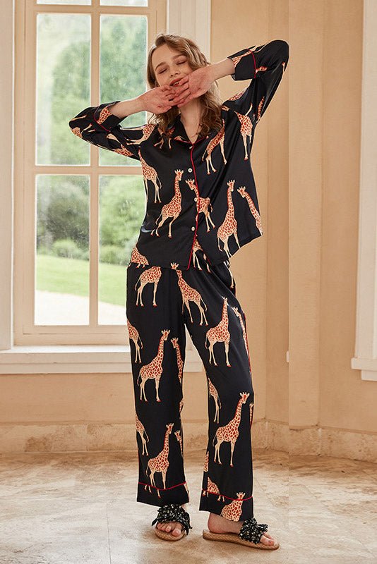 This long-sleeve pajama set features a stylish giraffe pattern against a sophisticated black background, offering a unique flair to your home attire.