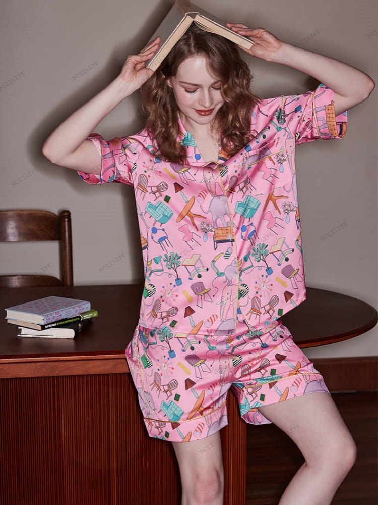 Add a playful twist to your loungewear with the Elephant and Furniture Print Ice Silk Short-Sleeve Loungewear Set. Featuring an eye-catching and whimsical print of elephants and furniture, this set includes a short-sleeve button-down shirt and elastic-waist shorts, both crafted from a breathable ice silk blend. The relaxed fit ensures comfort while the unique print brings a fun, creative flair to your homewear. Perfect for lounging at home or relaxing on a casual day, this set is both stylish and cozy.