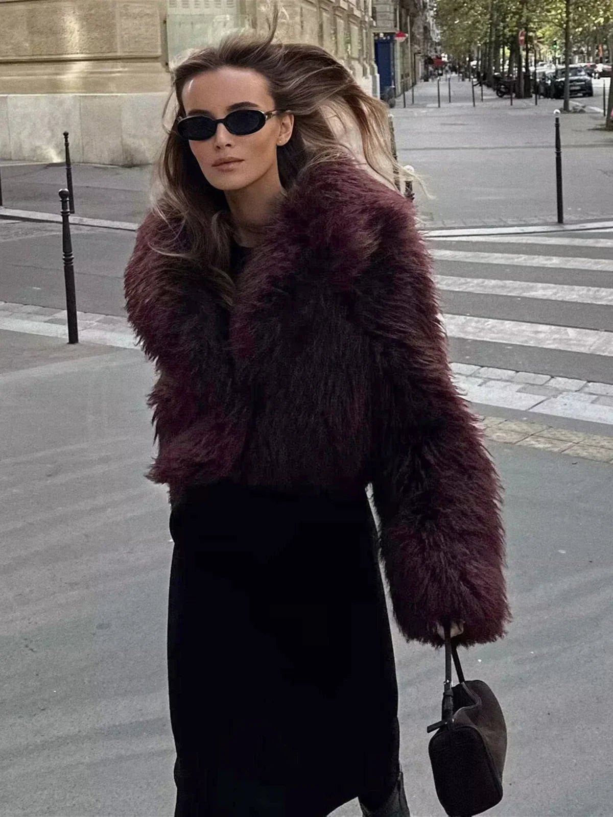 aElevate your cold-weather wardrobe with the Fuzzy Faux Fur Short Coatwhere luxurious texture meets effortless sophistication.