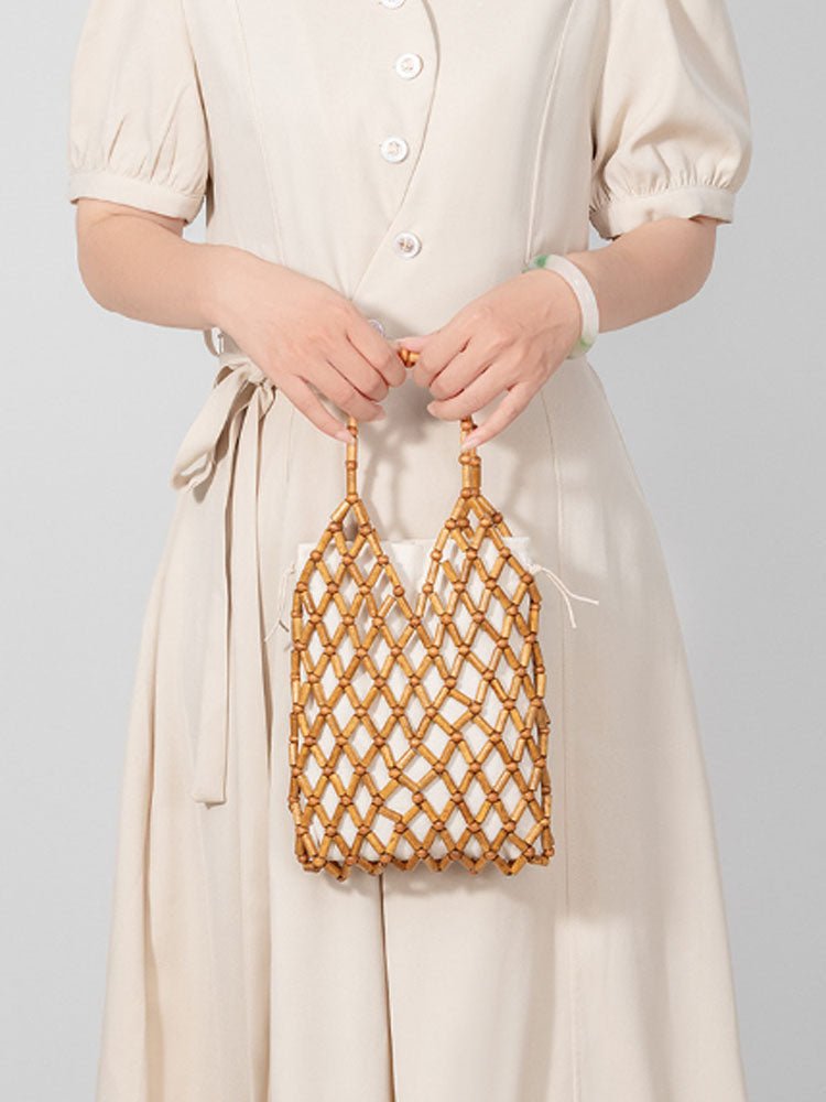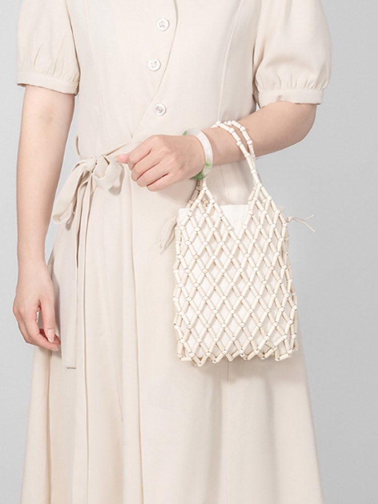 Hollow-Out Wooden Bead Woven Tote Bag