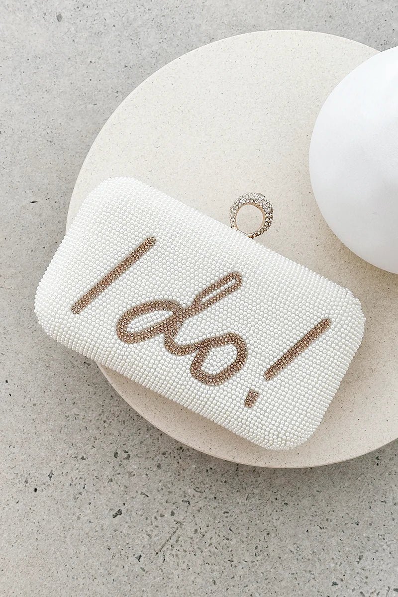 Introducing our elegant structured clutch, designed to make a statement at any special occasion. This chic accessory features a pearl-textured exterior with a sparkling diamante ‘I Do’ design, perfect for adding a touch of glamour. The secure clasp closure ensures your essentials stay safe, while the optional metal handle and removable chain strap offer versatile carrying options.