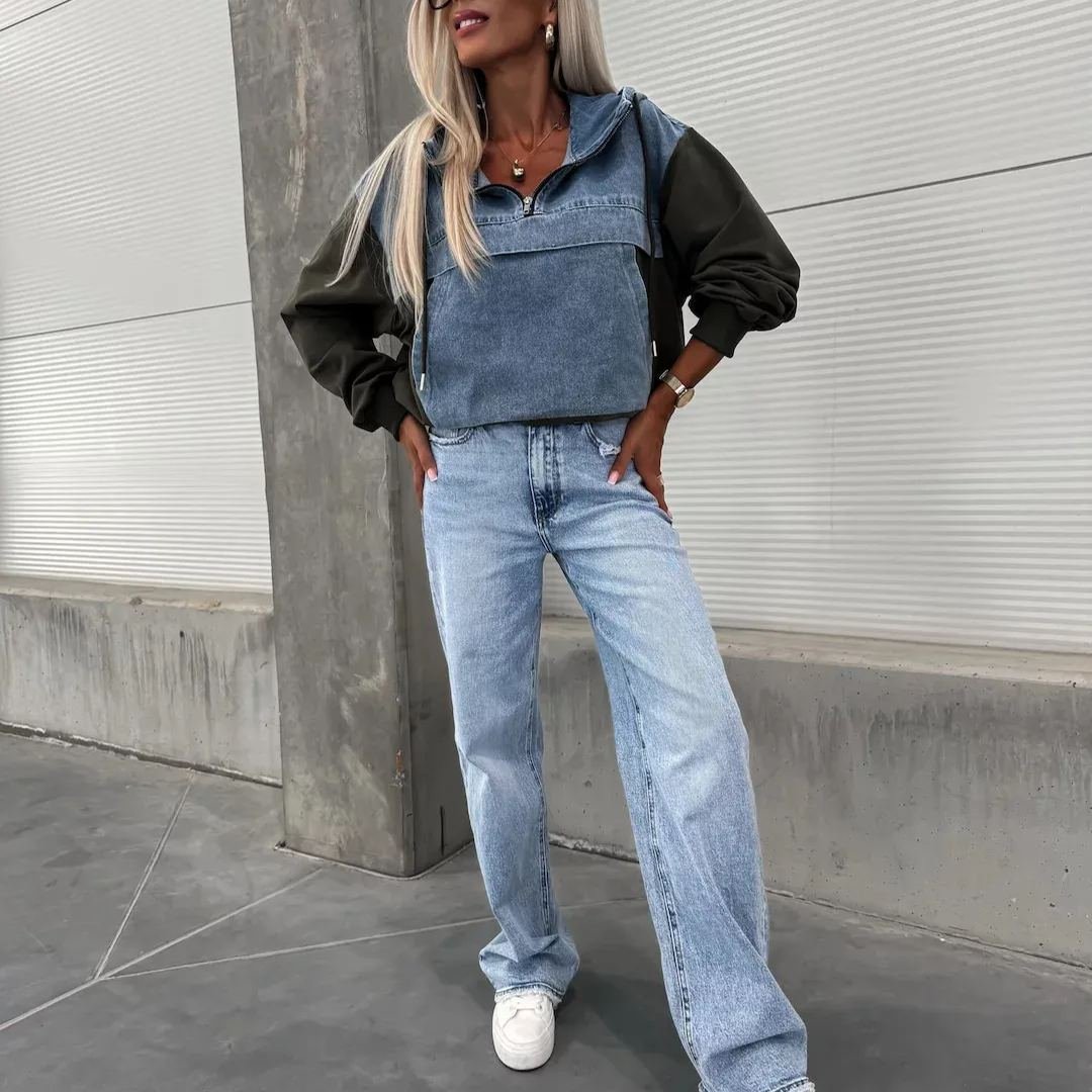 Loose Casual Wash Denim Patchwork Hoodie