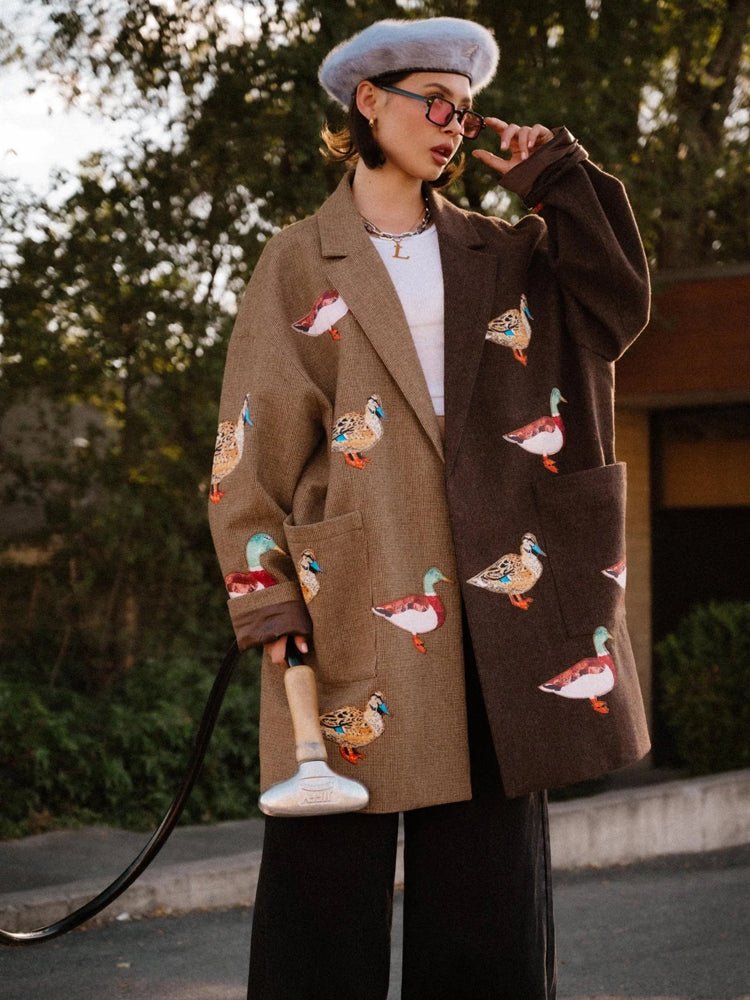 A playful yet statement-ready oversized coat featuring a half-patchwork design that blends solid fabric with classic plaid. Charming lucky-duck appliqus are scattered throughout, adding a whimsical, standout touch to its structured, boxy silhouette. Designed with dropped shoulders, a full lining, large front patch pockets, and an open-front lapel, it delivers both comfort and visual personality.