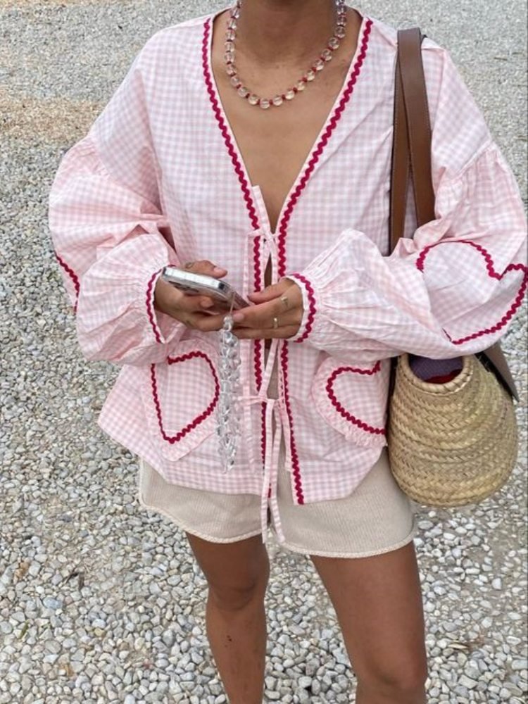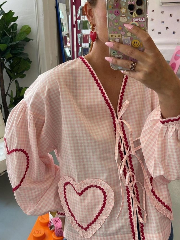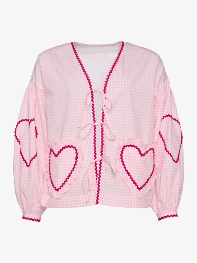 Organic Cotton Top is made in organic cotton poplin in light pink printed checks. The top has long sleeves with gathers at the top and at the slim cuffs. It has three sets of bow tie strings to be tied at the placket front. The top also features our iconic heart-shaped pockets with ruffle edges and is delicately decorated with zig-zag tapes in a strong color of rose red. The zig-zag tape is placed along the placket front, at the cuffs, the pockets and on each elbow in a hearts-shaped decoration.