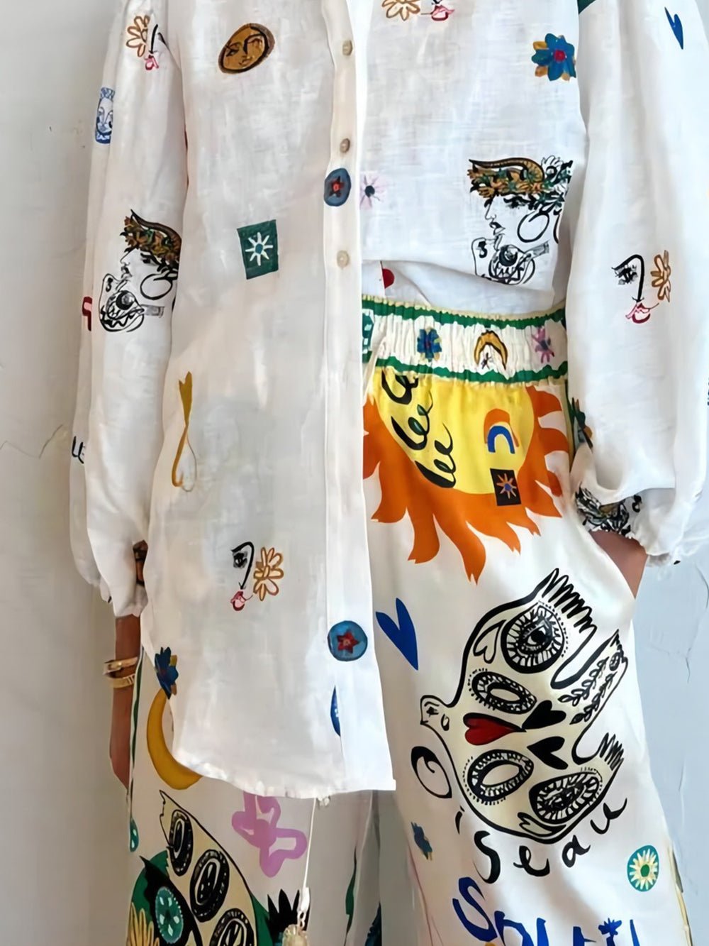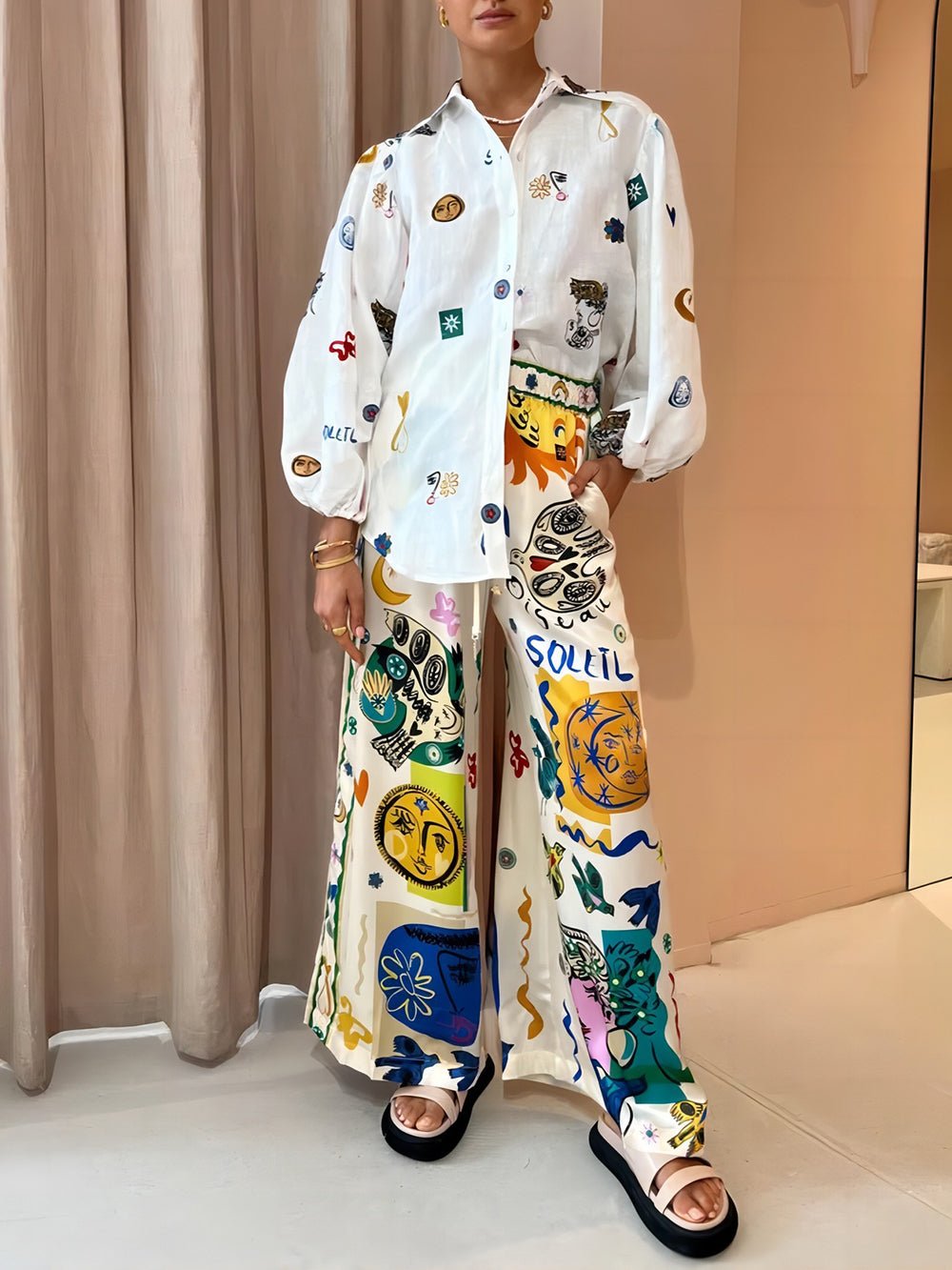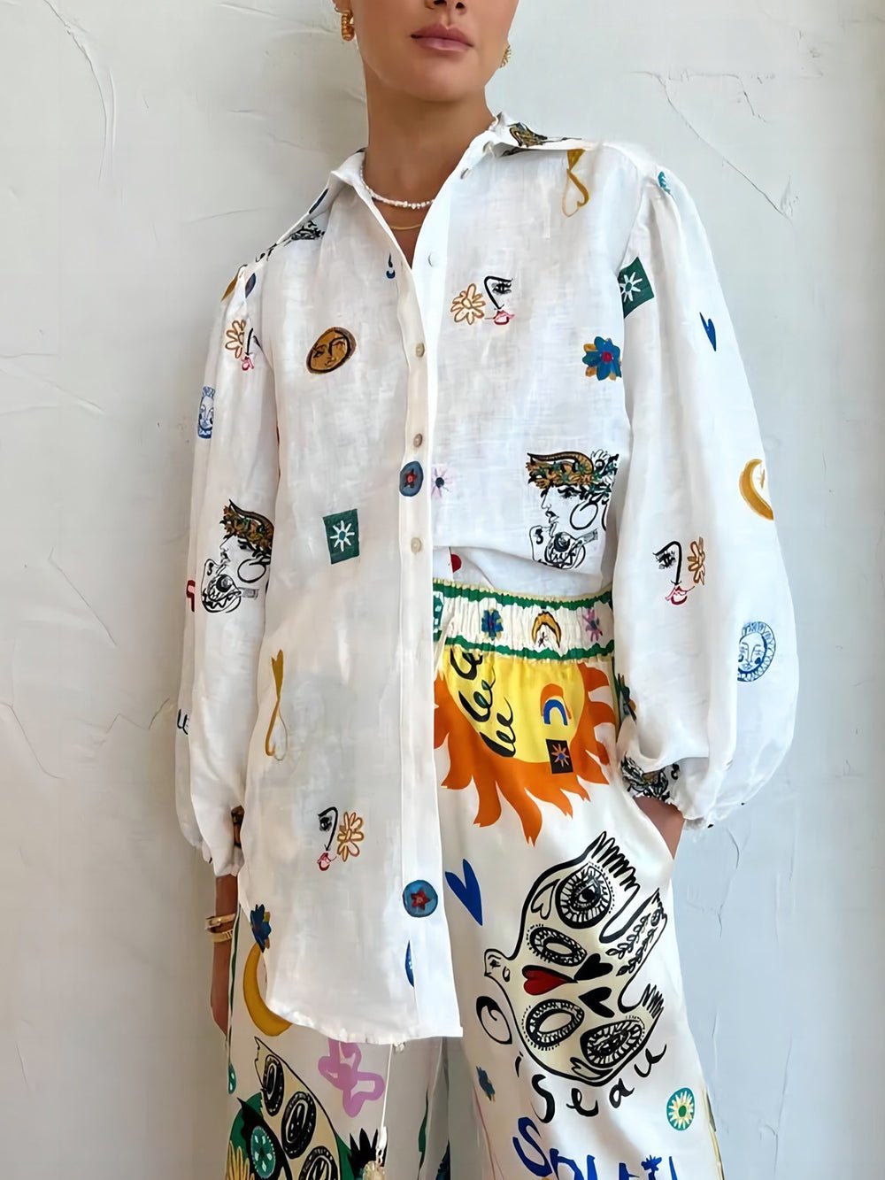 The eye-catching graffiti print adds a vibrant and artistic touch to the shirt, bringing an edgy and modern vibe to your look. The lantern sleeves add a touch of drama and elegance, creating a flattering silhouette that complements any body shape.