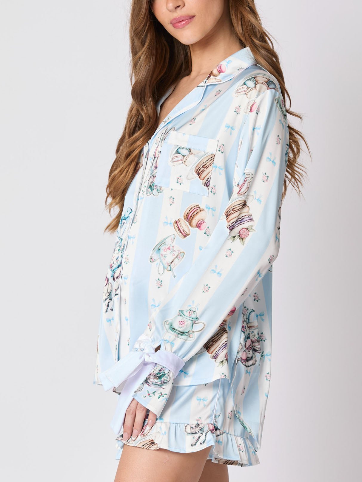 Indulge in charming comfort with the Tea Party Print Bow Tie Pajama Setaa sweet, whimsical touch to your nighttime routine. This delightful set features a playful tea party print scattered with teacups, pastries, and floral accents, perfect for adding a bit of elegance to your evening.