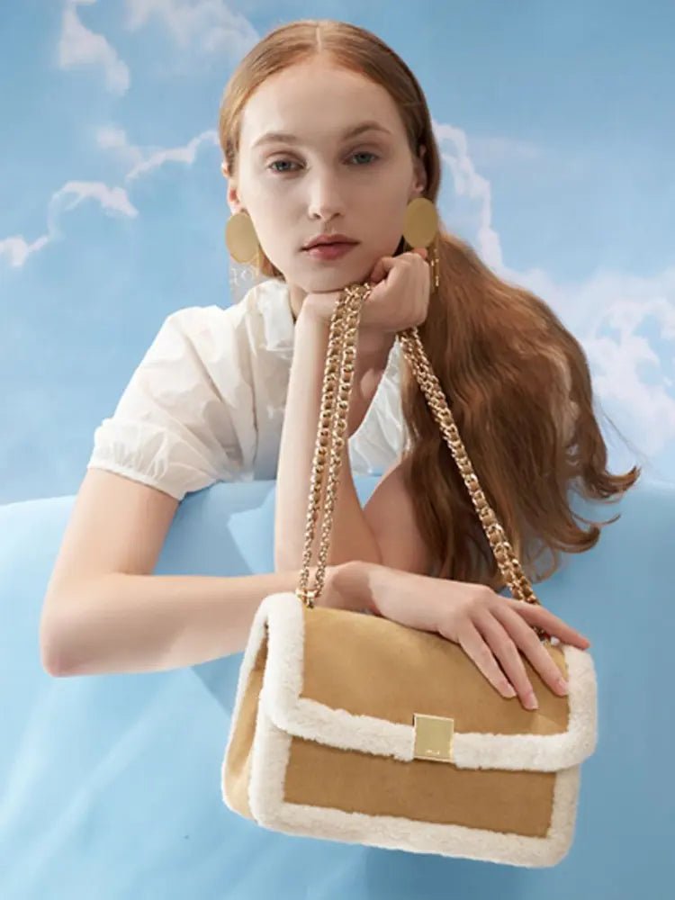 Designed for the colder seasons, this vintage-inspired shearling bag combines cozy texture with refined craftsmanship. Made from genuine leather and accented with soft snow-like shearling trim, it brings warmth and luxury to your autumn and winter wardrobe. The spacious interior accommodates your daily needs, while the structured silhouette and wide strap offer all-day comfort in style. A chic blend of softness and strength, perfect for colder days.