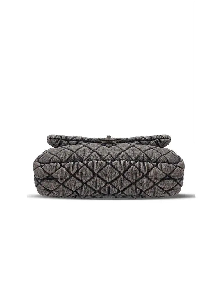This washed denim quilted chain bag fuses casual attitude with refined street style in a compact, fashion-forward silhouette. Featuring soft diamond quilting and distressed denim texture, it offers a relaxed yet edgy vibe. The gleaming chain strap adds contrast and versatility, allowing it to be worn as a crossbody, underarm bag, shoulder bag, or even carried as a clutch. Designed for trendsetters who appreciate bold yet wearable design with a touch of vintage flair.
