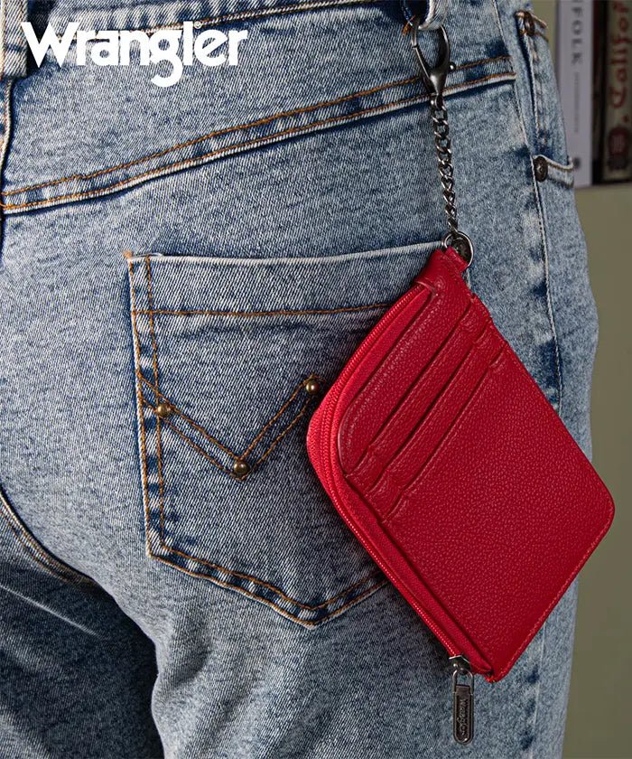 This Wrangler All-Over Aztec Print Mini Zip Card Case seamlessly blends Southwestern artistry with everyday practicality. Crafted from durable synthetic leather and canvas, it showcases a vibrant Southwestern print that embodies rugged charm and cultural flair.