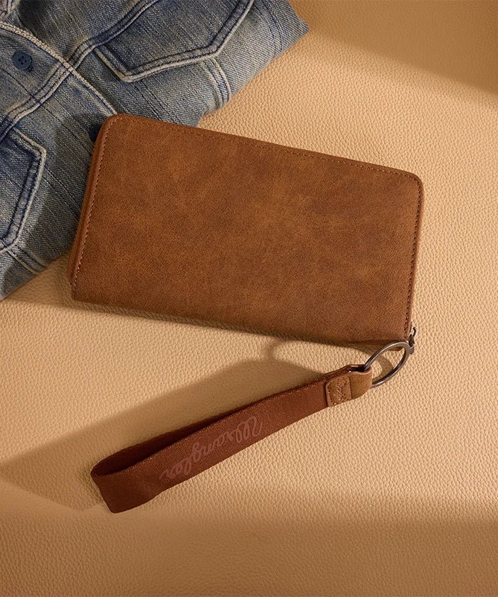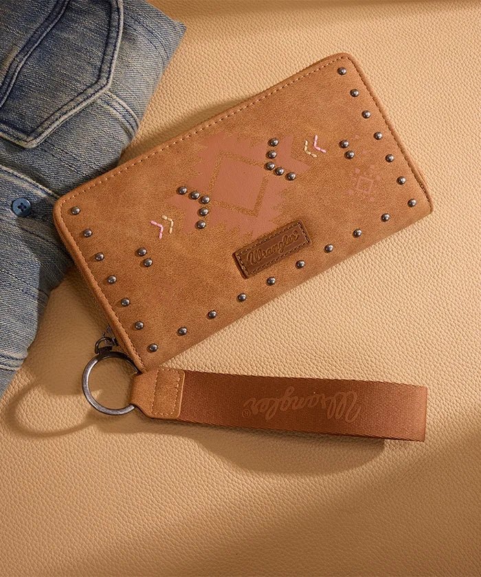 The Wrangler Aztec studded tote bag combines rugged style and everyday function with a bold geometric design and rivet detailing. Crafted from durable faux leather, this studded tote bag features a roomy main compartment and a matching wallet for organized carry.