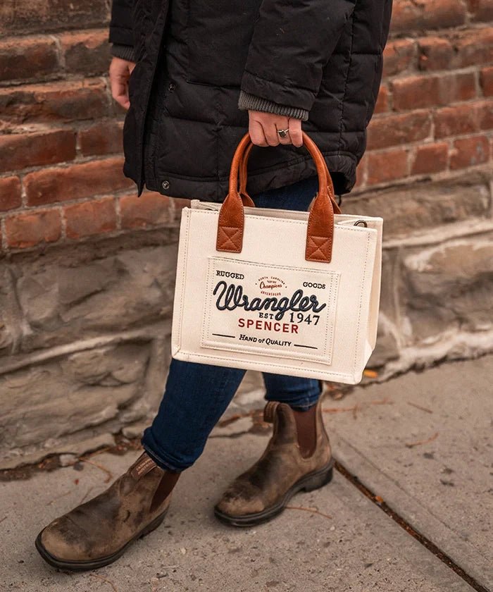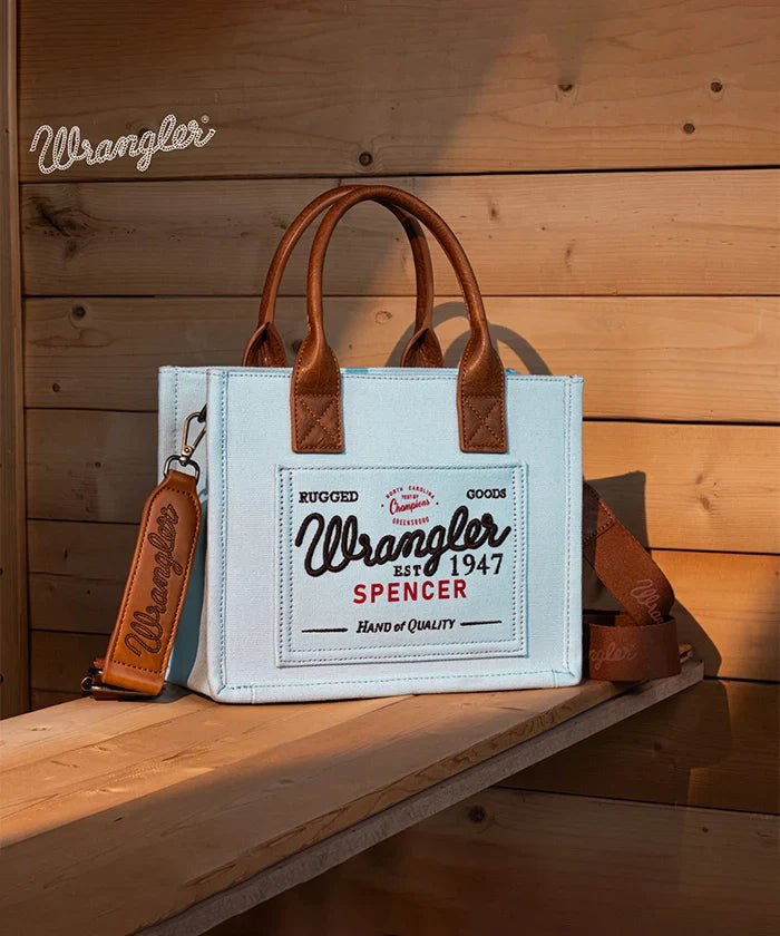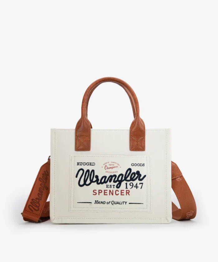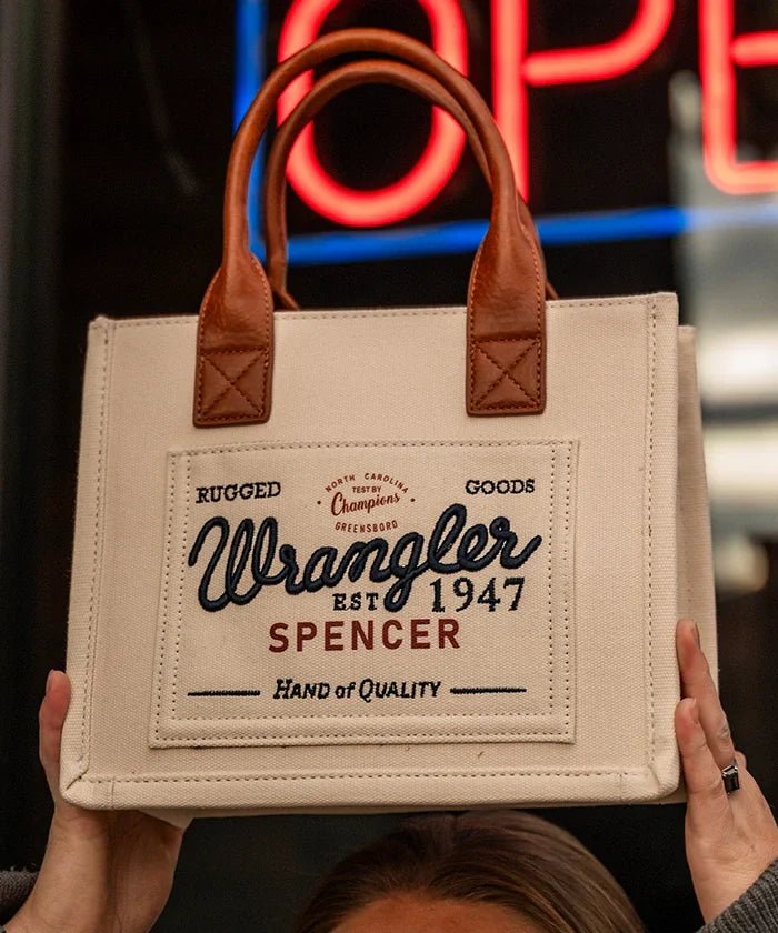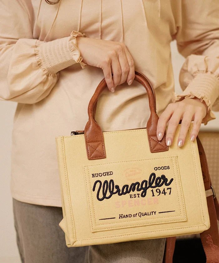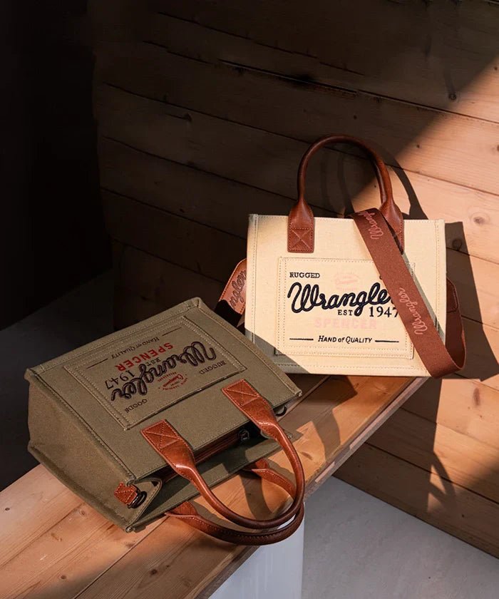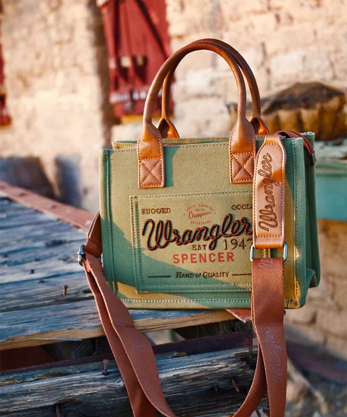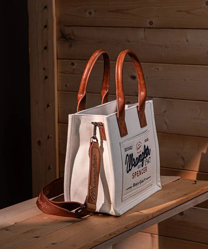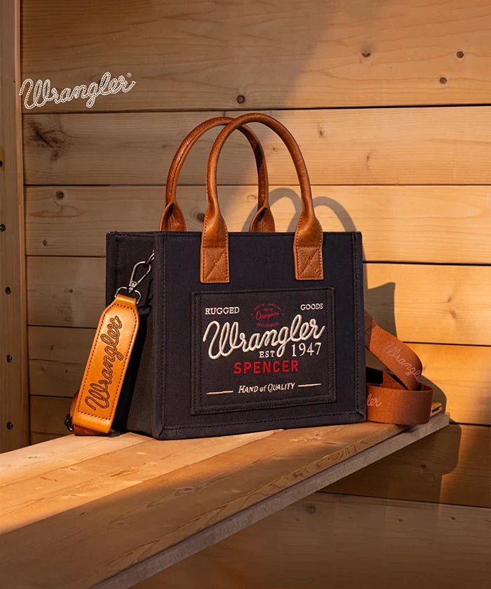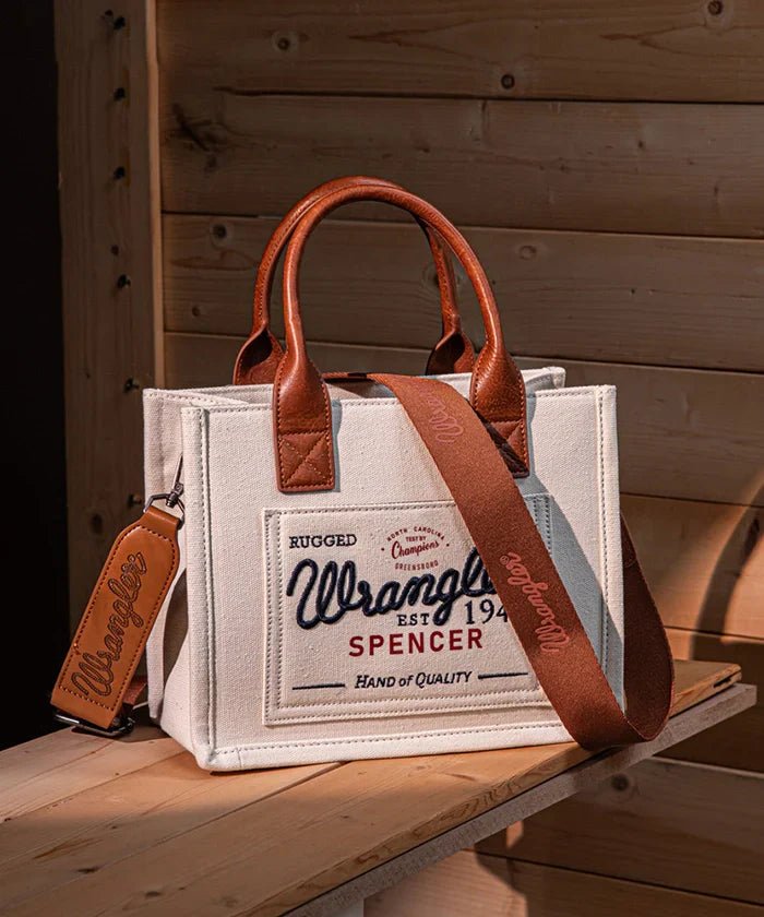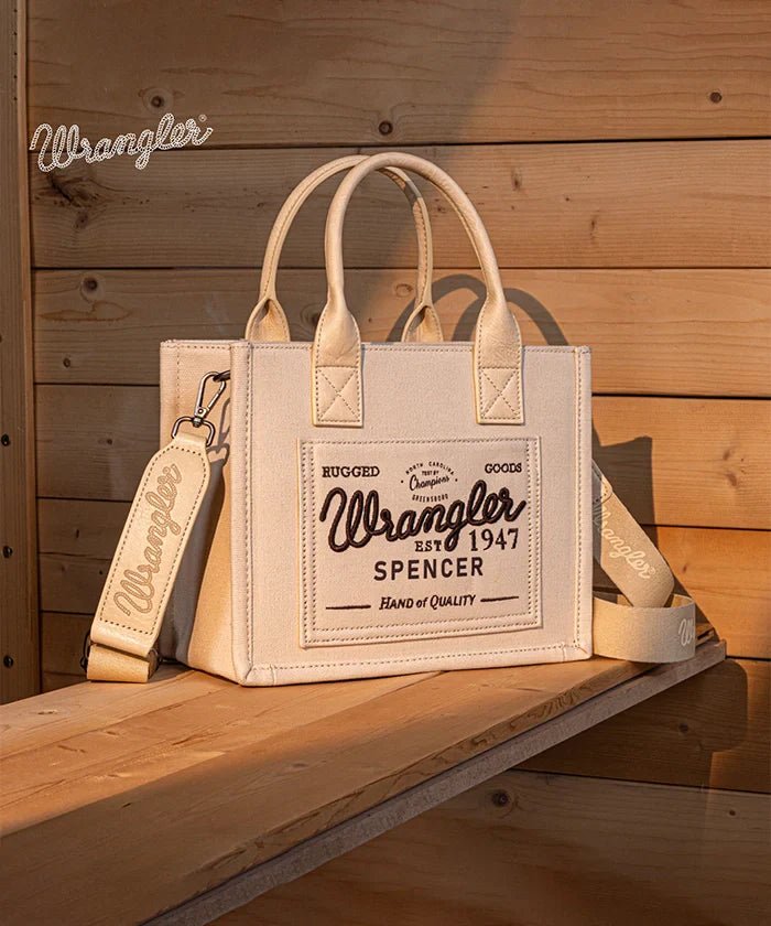 Made of canvas and synthetic leather, featuring a bold Wrangler logo and embroidered letters on the front pocket for rugged sophistication. -
