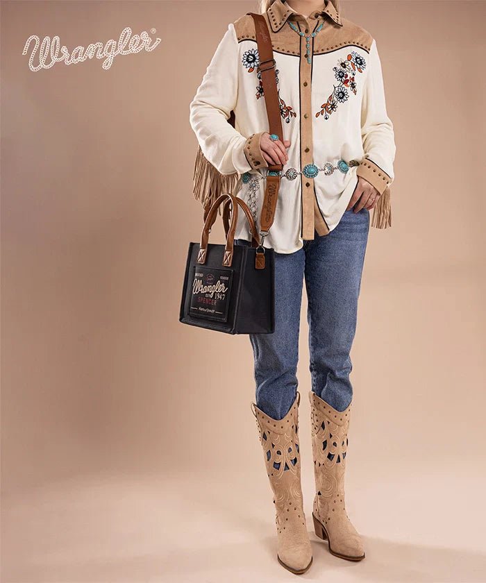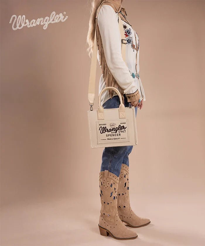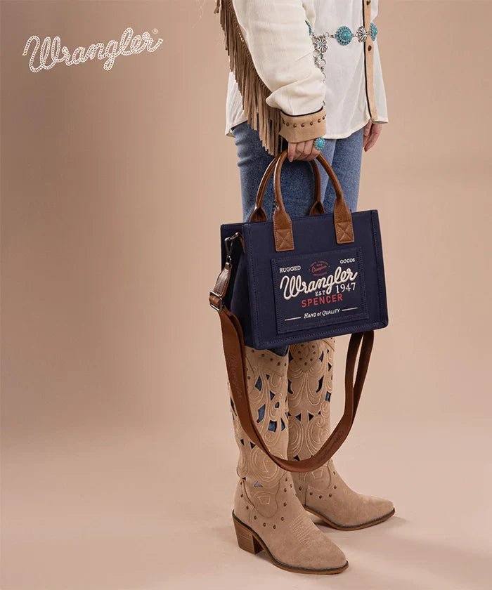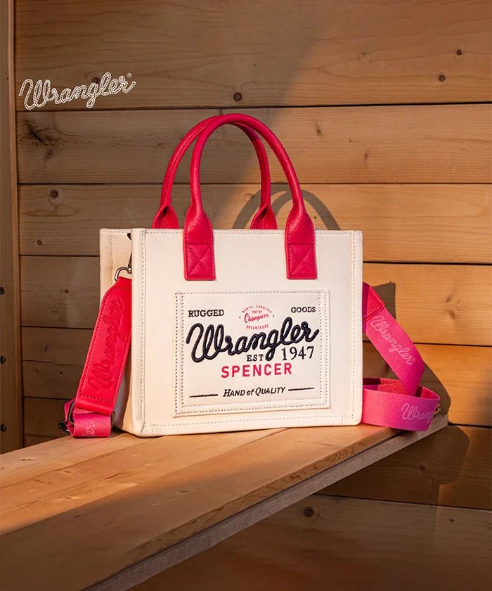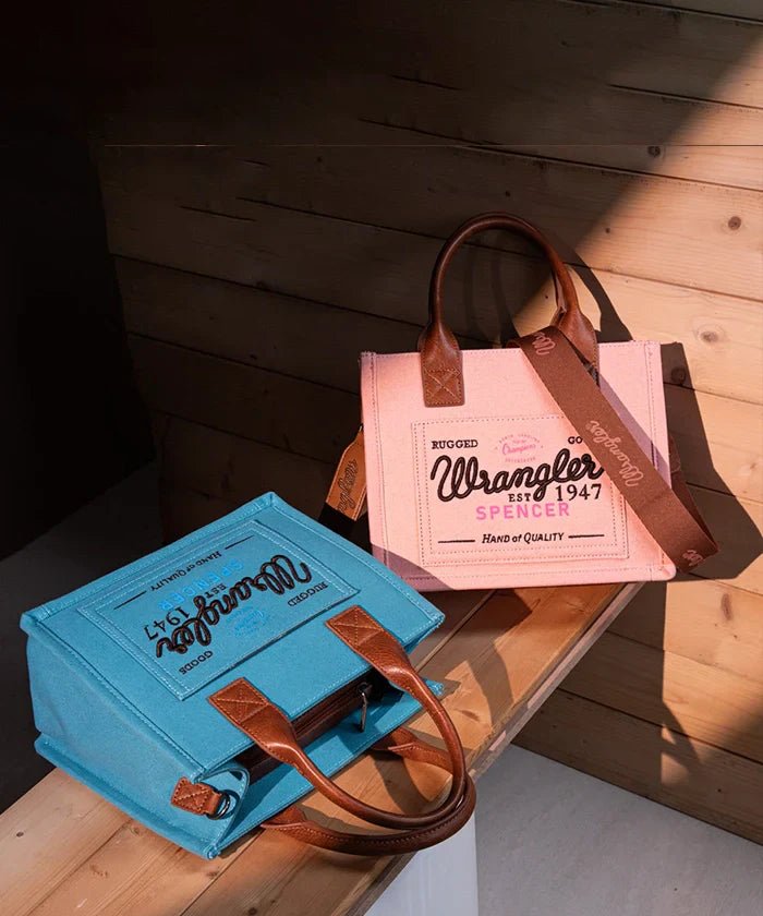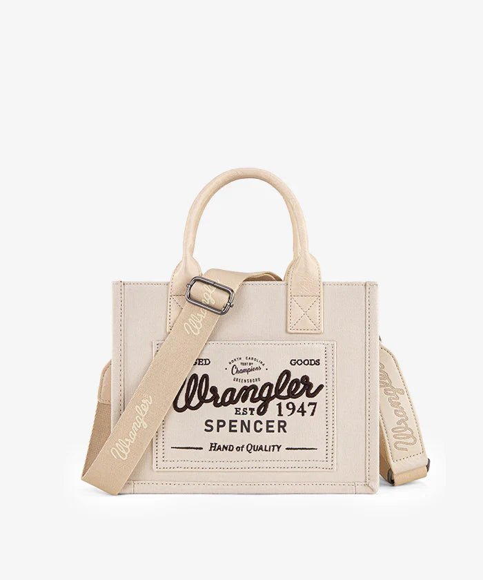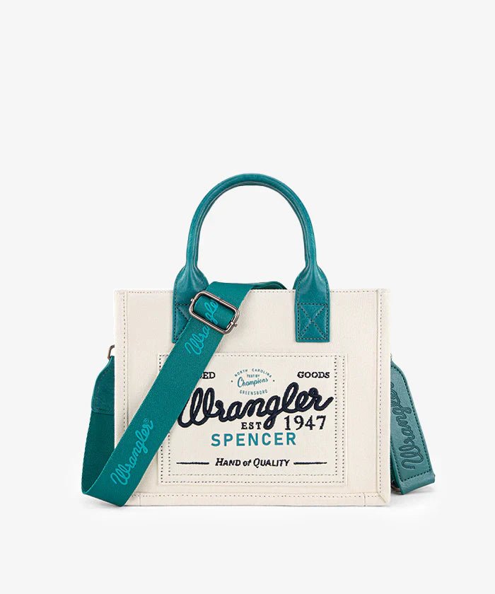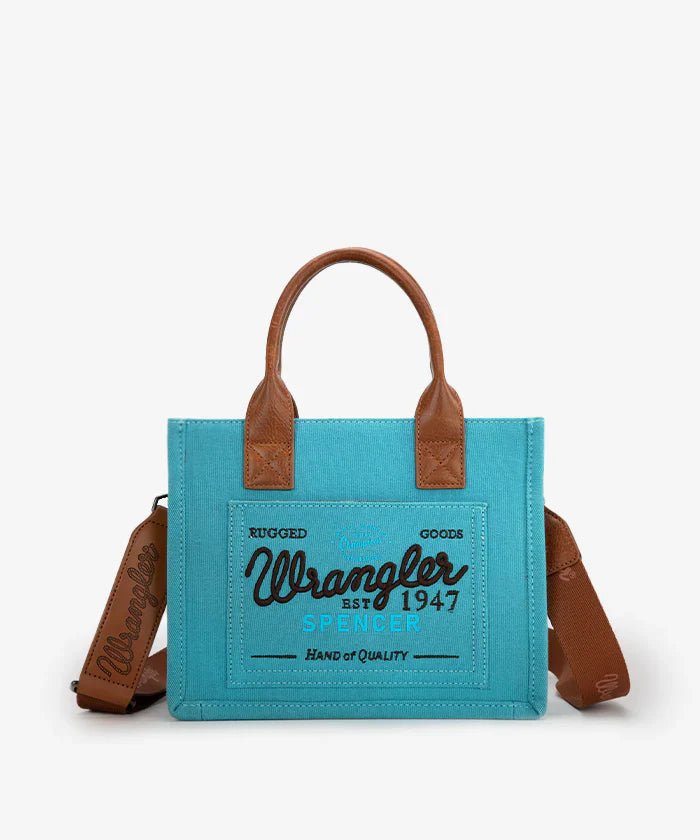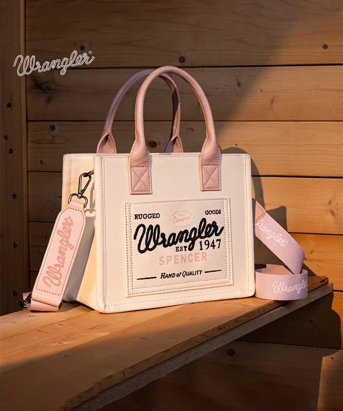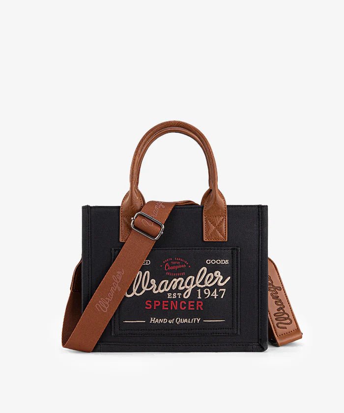 Made of canvas and synthetic leather, featuring a bold Wrangler logo and embroidered letters on the front pocket for rugged sophistication. -