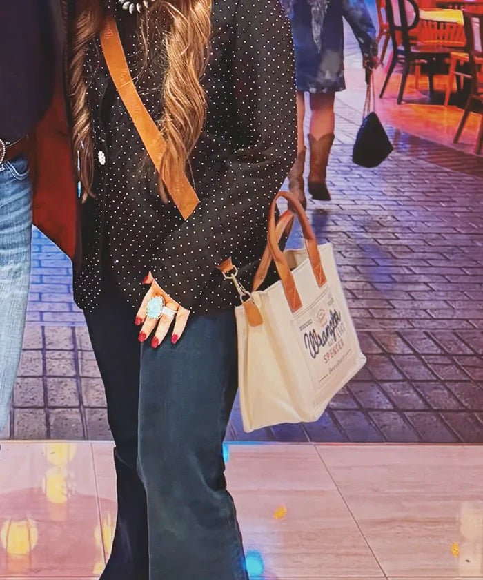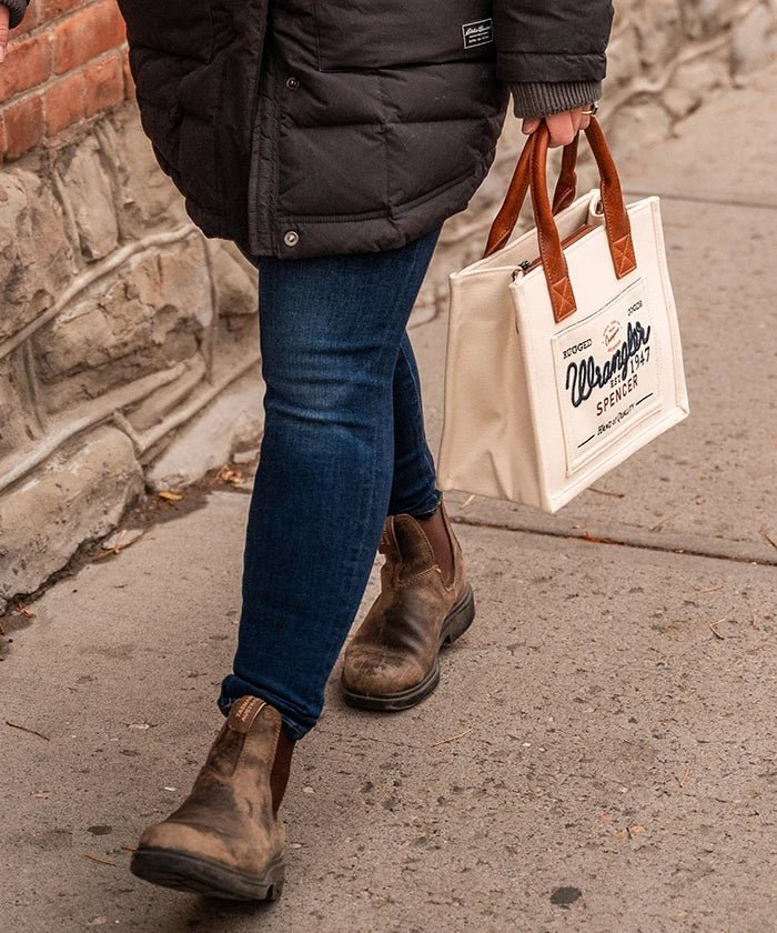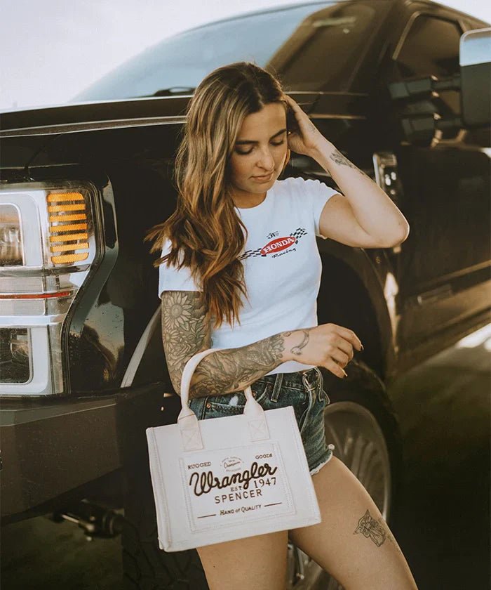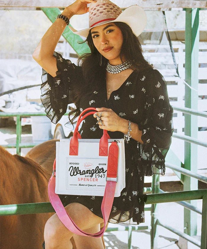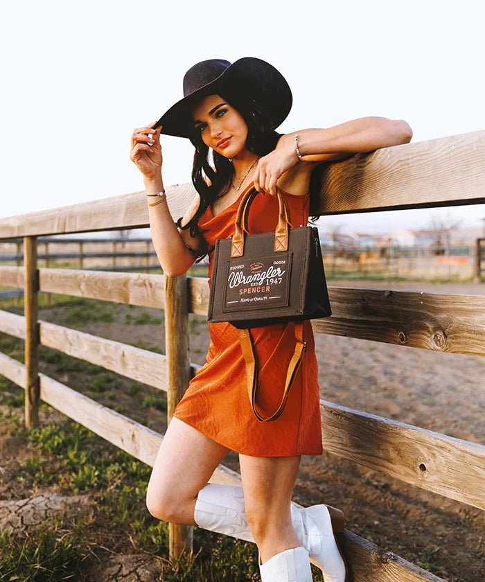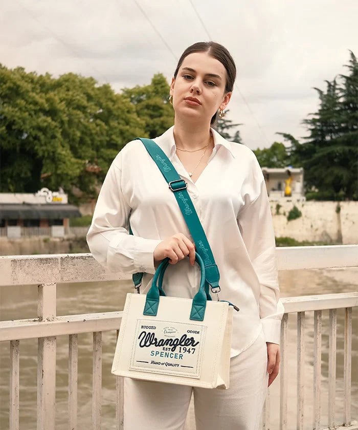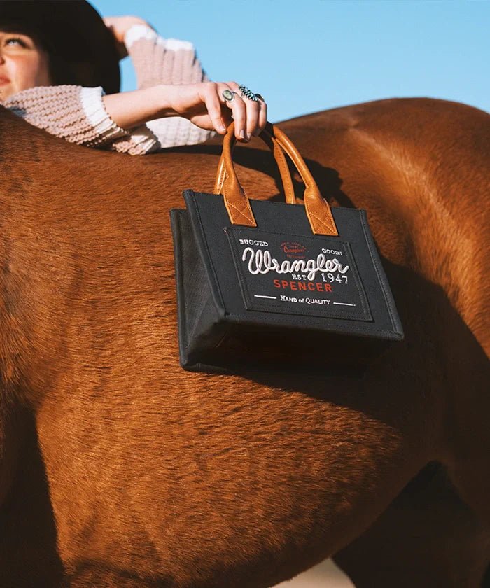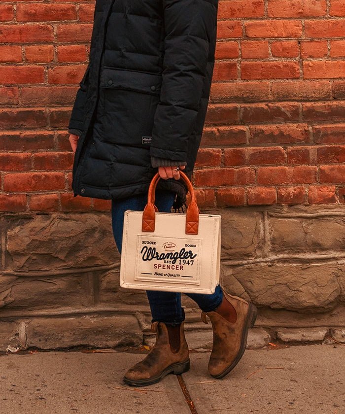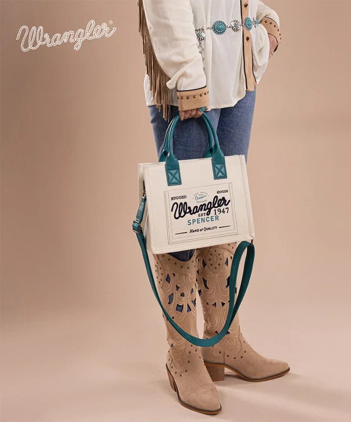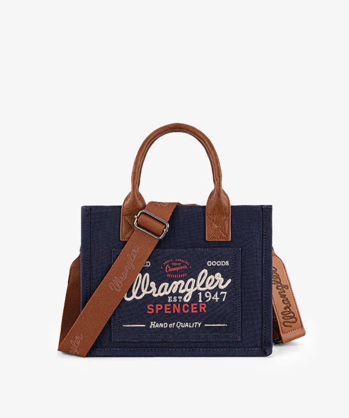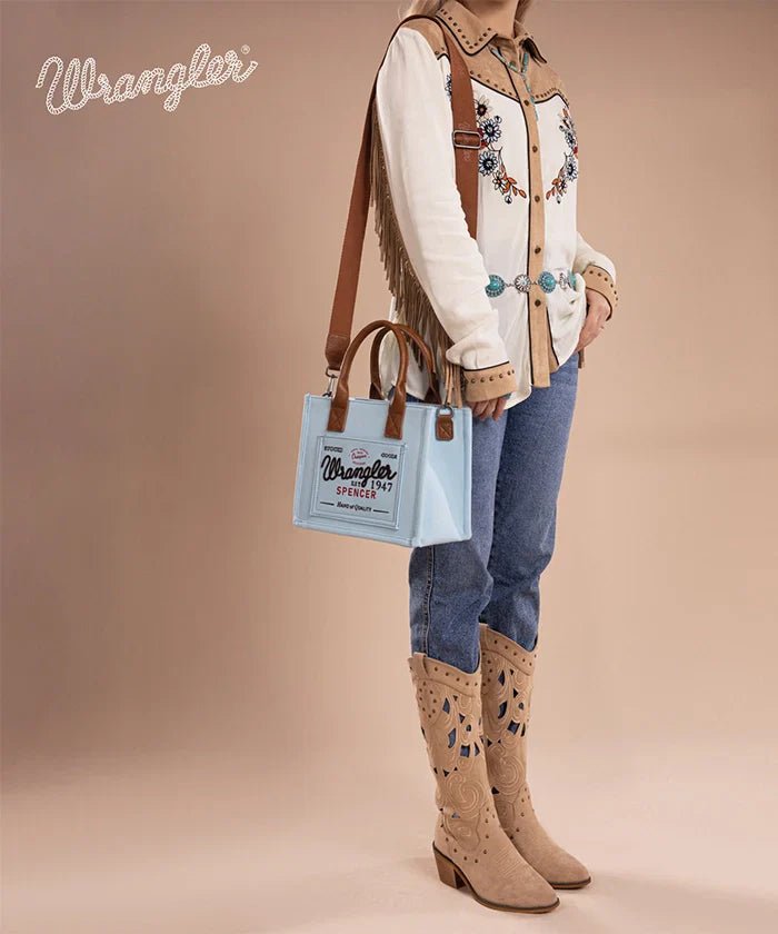 Made of canvas and synthetic leather, featuring a bold Wrangler logo and embroidered letters on the front pocket for rugged sophistication. -